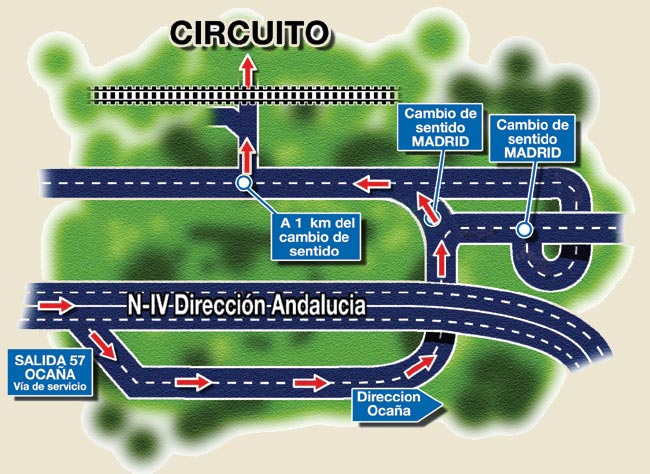 Si se viene de Madrid por la A4, en el Km 57 se toma la salida a la ITV. A unos 2,5 Km se pasa por debajo de la autovía. Nada más pasar el túnel, hay un cambio de sentido a la izquierda, que hay que tomar. A 1 Km tomamos un camino asfaltado que sale a la derecha y pasados unos metros cogemos el camino de la derecha, que nos lleva a un túnel, pasado el cual nos encontramos con el circuito.
